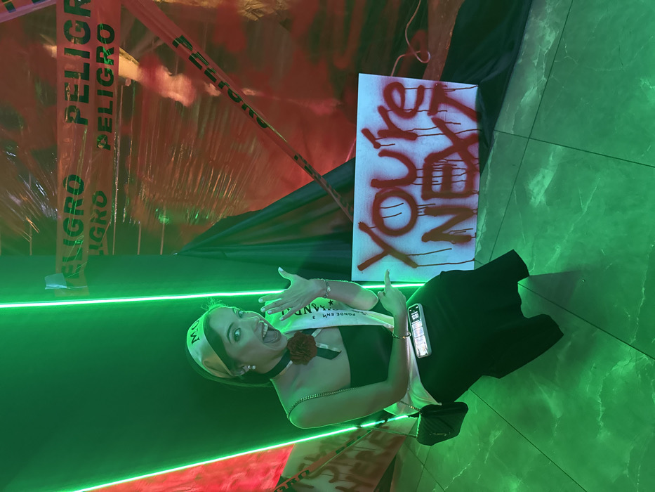 A woman in a black outfit and a "MUNDIAL 3" sash poses in a decorated space. She gestures excitedly with one hand while holding a phone in the other. Above her, a sign reads "YOU'RE NEXT" in red spray paint. The backdrop features "PELIGRO" warning tape and draped materials in red and orange tones. The scene is illuminated with green and red lighting, adding a dramatic and celebratory atmosphere.