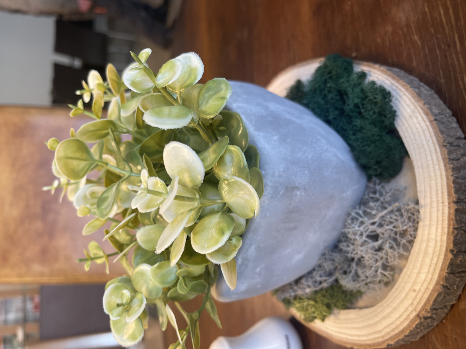 The image displays a close-up, slightly elevated view of a decorative artificial plant arrangement on a wooden table within an indoor setting in Sofia, Bulgaria. The primary subject is a small, artificial plant featuring numerous light green to yellowish-green, oval-shaped leaves, some exhibiting lighter, variegated edges. This plant is housed in a roughly heart-shaped, grey pot with a textured, concrete-like finish. The pot rests on a circular wooden slice, approximately 1 cm thick, which serves as a coaster or base. The wooden slice shows its natural bark perimeter and visible growth rings on its smooth top surface. Surrounding the base of the pot on this wooden slice are two distinct types of artificial decorative moss: a patch of dark green, finely textured moss on the right, and a patch of lighter, whitish-grey, intricately branched lichen-like moss on the left. To the immediate left of the wooden slice, a partial view of a small, white, cylindrical object is visible, possibly a condiment shaker, with a dark horizontal line near its base. The background is significantly out of focus. It shows a warm, reddish-brown wall or large surface on the left and center. To the right, blurred dark shapes are visible, consistent with chairs or furniture, and a very indistinct, blurry human form is barely discernible in the far right background, indicating the presence of other individuals in the wider environment. The scene suggests a casual interior space, likely a cafe or restaurant. No specific actions or interactions are directly observable.