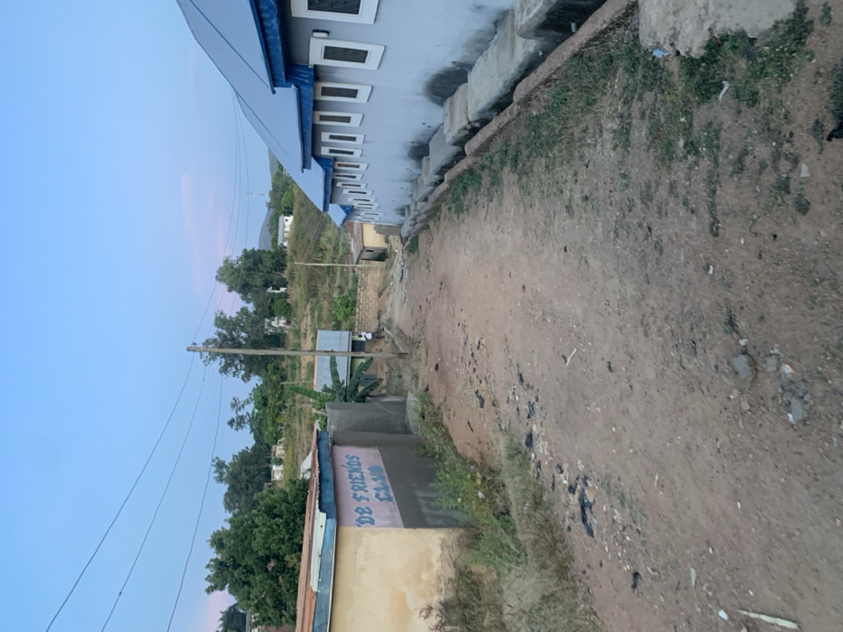 The image captures an unpaved, reddish-brown dirt road in a residential or semi-urban area of Jos, Nigeria, under a clear, light blue sky with a faint pink hue, indicative of dawn or dusk