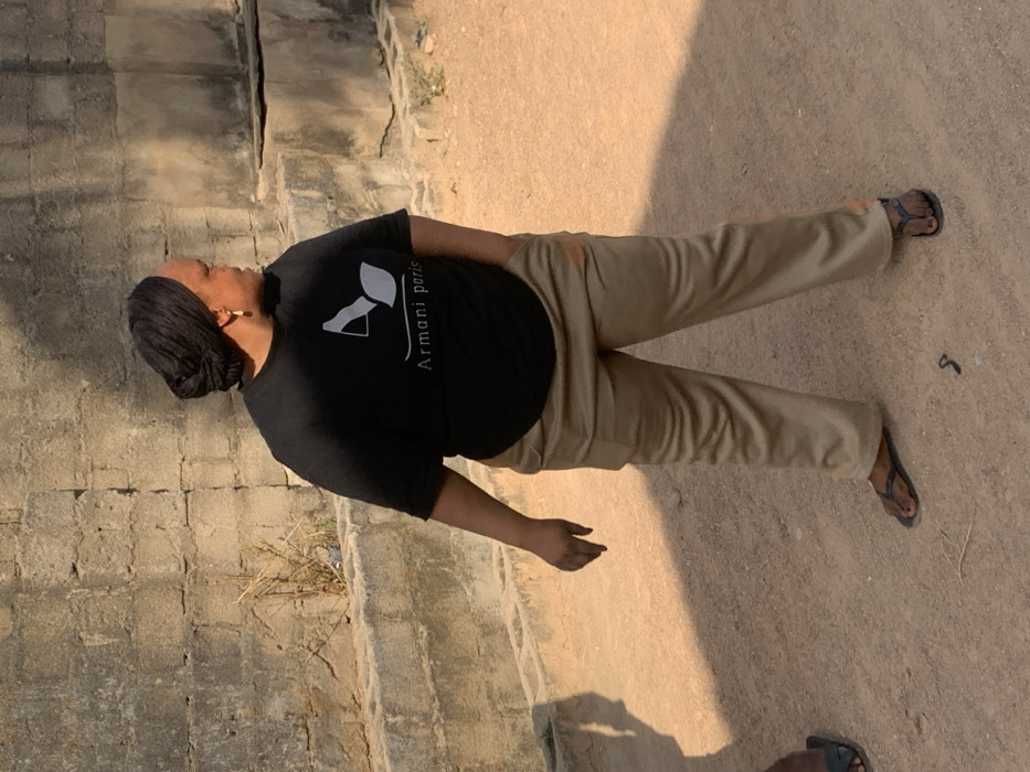 A woman wearing a black T-shirt with white text and a shoe logo poses outside. She has on tan pants and dark-colored flip-flops. Her dark hair is wrapped. The woman stands on a dirt surface next to concrete stairs, her right arm hanging loosely. A pair of flip-flops are also visible near the bottom of the frame.