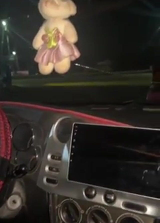 dashboard of a car at night. A stuffed hippo wearing a pink dress hangs from the rearview mirror. The car's infotainment screen is large and rectangular, and below it are climate control knobs. The steering wheel is covered with a red and black crocheted cover. The car is parked on a street, and there are other cars visible in the background.