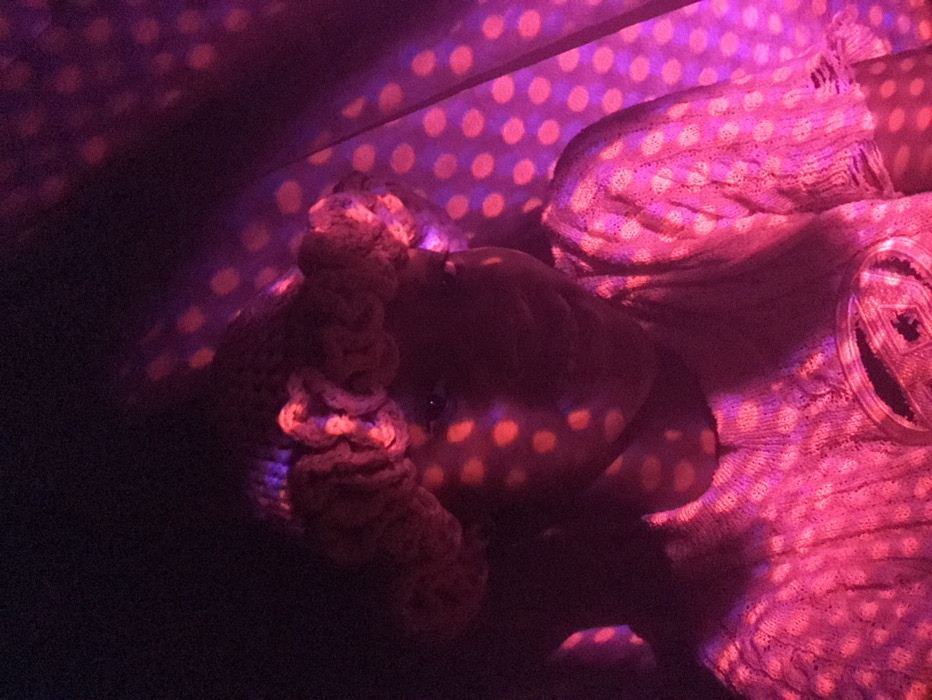 Under a strong pink-purple light punctuated by circles, a textured object lies partially obscured. It appears to be intertwined with fabric, perhaps draped or resting on it. The fabric itself has a dotted pattern and is folded. The composition is dark and enigmatic, with much of the subject hidden in shadow, adding a layer of mystery. A circular item with patterned holes sits on the right edge.
