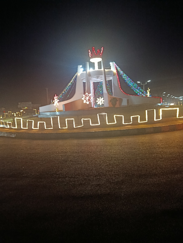 - "A nighttime view features a decorated traffic circle with a multi-tiered white structure topped by a lit crown" by FM-xQ01I3, licensed under CC BY 4.0