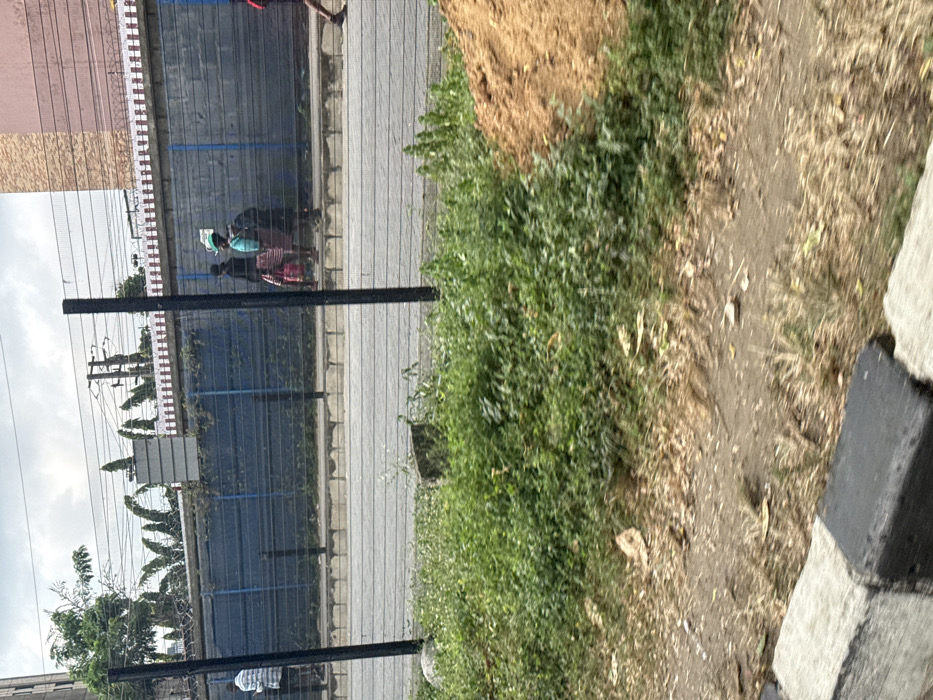 The image depicts a street scene in Falomo, Nigeria, observed from a low angle behind a fence. In the immediate foreground, a black and white striped curb runs horizontally, bordered by a dirt strip with sparse dry grass and scattered debris. To the right, a mound of light brown sand or dirt is present. The mid-ground features a dense patch of green vegetation. A wire mesh fence with two prominent black vertical posts spans the central portion of the frame, separating the foreground from a paved road. Beyond the road, a raised concrete curb or sidewalk runs along the base of a blue wall with visible horizontal support beams. Above this blue wall, a structure with a red and white patterned facade is visible, topped by barbed wire fencing. To the left, green trees and foliage, including distinctive banana leaves, are seen. Further left, a multi-story building with a light pinkish-brown exterior is partially visible. In the background to the left, a utility pole with multiple cross arms and electrical lines stands against an overcast sky. Several individuals are present beyond the fence. On the far left, one person in a light-striped shirt and dark trousers stands facing right. In the central background, three individuals are walking from left to right along the sidewalk behind the blue wall. The first is dressed in dark clothing and carries a reddish bag. The second wears a light blue-green top, a dark skirt, and balances a white object on their head. The third, also in dark attire, carries a pink or red item. On the far right, the lower body of another individual, wearing dark shorts and sneakers, is partially visible as they walk towards the right.