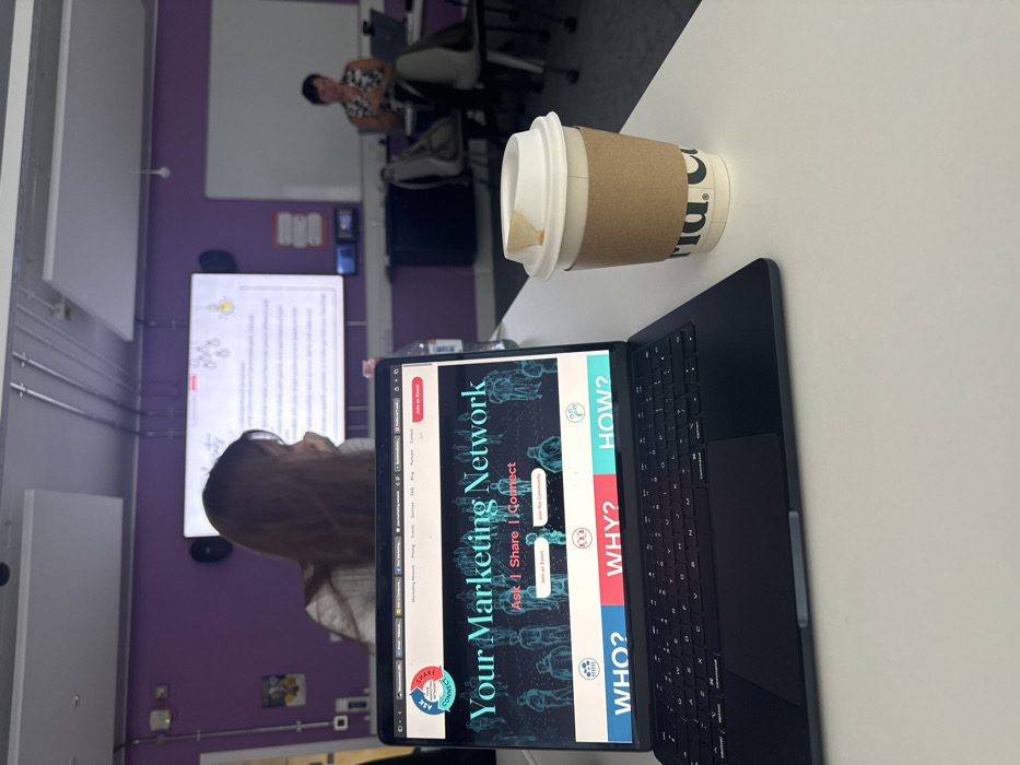 laptop computer and a takeaway coffee cup on a white table. The laptop screen displays the website for “Your Marketing Network,” which features a blue and red logo with the text “Ask | Share | Connect.” Below this are three buttons that say “WHO?”, “WHY?”, and “HOW?” The laptop keyboard is visible. Behind the laptop, a person with long brown hair is sitting in a chair, facing the laptop. They are wearing a white shirt. On the left wall behind the person is a white board. A person is sitting in a chair facing a large screen, which is displaying a white presentation, in the background. This scene takes place in a room with purple walls, white ceiling, and white furniture. This location is in the city of Cambridge, United Kingdom (latitude: 52.204, longitude: 0.134).