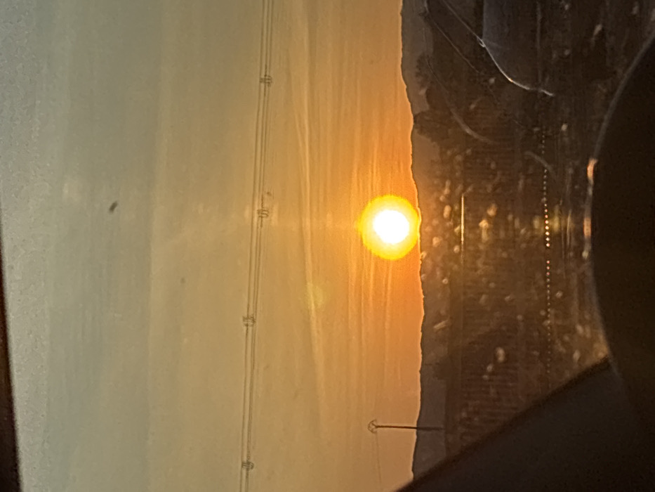The image depicts an outdoor scene at sunrise or sunset in Ávila, Spain, observed through the windshield of a vehicle. The sky presents orange and yellow gradients with subtle horizontal cloud formations. The sun, a brilliant circular orb, is situated low on the horizon, slightly left of center, emitting a strong glare. A landscape of silhouetted hills or mountains stretches along the horizon. Multiple parallel power lines, equipped with insulators, traverse the mid-ground horizontally. To the left, a dark utility pylon with a Y-shaped top is silhouetted against the sky. Indistinct dark structures are visible below the power lines. The lower foreground reveals elements of the vehicle's interior, specifically the dashboard and a partial steering wheel rim on the right. The windshield displays numerous small, circular light reflections or debris specks.