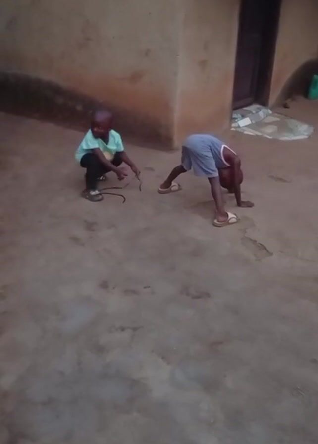 Two children are playing outside near a building. One child in a light blue shirt and dark pants holds a dark cord and dances and laughs. A second child, wearing a grey sleeveless shirt and shorts, touches the ground with both hands and legs in the air, then stands up and runs out of the frame. A third child, in a white dress and white shoes, runs into the frame from the left and then out of the frame to the left. The ground is grey concrete. The building is light brown or tan. The sky is dark.