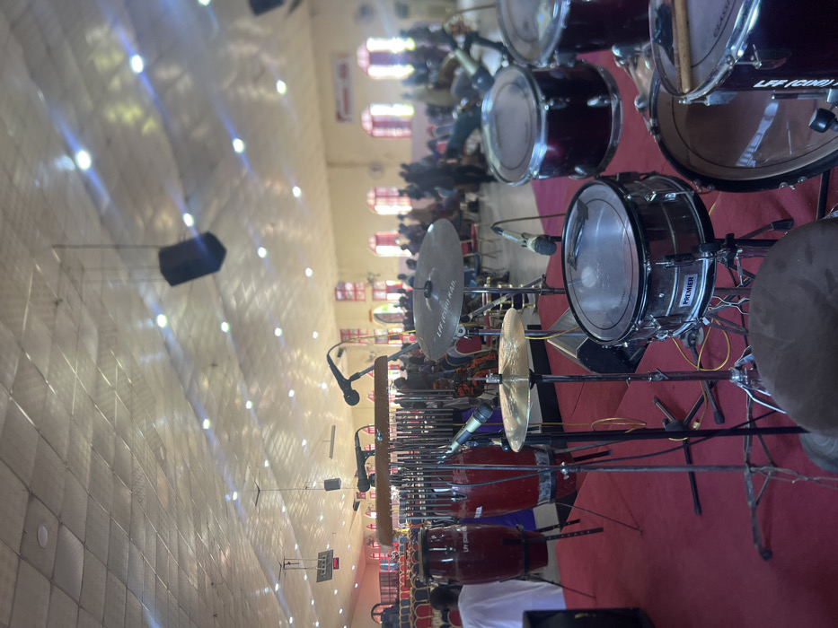 The image displays an indoor scene within a large hall, likely a church or event center, located in Dadi Riba, Nigeria. In the foreground, a musical stage is set with a drum kit and other instruments on a red carpet. The drum kit, partially visible on the right, includes a "PREMIER" snare drum, dark red/maroon tom drums, a bass drum, a hi-hat cymbal, and a larger "LFF ICON KAIL" crash/ride cymbal. Drumsticks rest on one of the drums, and a brown drum stool is positioned in the lower center. To the left of the drum kit, two red conga drums on stands and a set of bar chimes are present. Multiple microphones on stands are strategically placed around these instruments. Beyond the stage, a large congregation of people is gathered, mostly out of focus, filling the midground and background. Individuals are seated on red and white chairs, while others stand. Attire varies, with some visible figures wearing traditional garments, such as a white flowing robe on the far left. The hall features light-colored walls with multiple arched windows, framed in red, allowing natural light. The ceiling is constructed from white or light-colored acoustic tiles and is illuminated by numerous recessed circular lights. Several black loudspeakers are suspended from the ceiling. Banners are visible on the far walls. The scene is brightly illuminated by both artificial and natural light.
