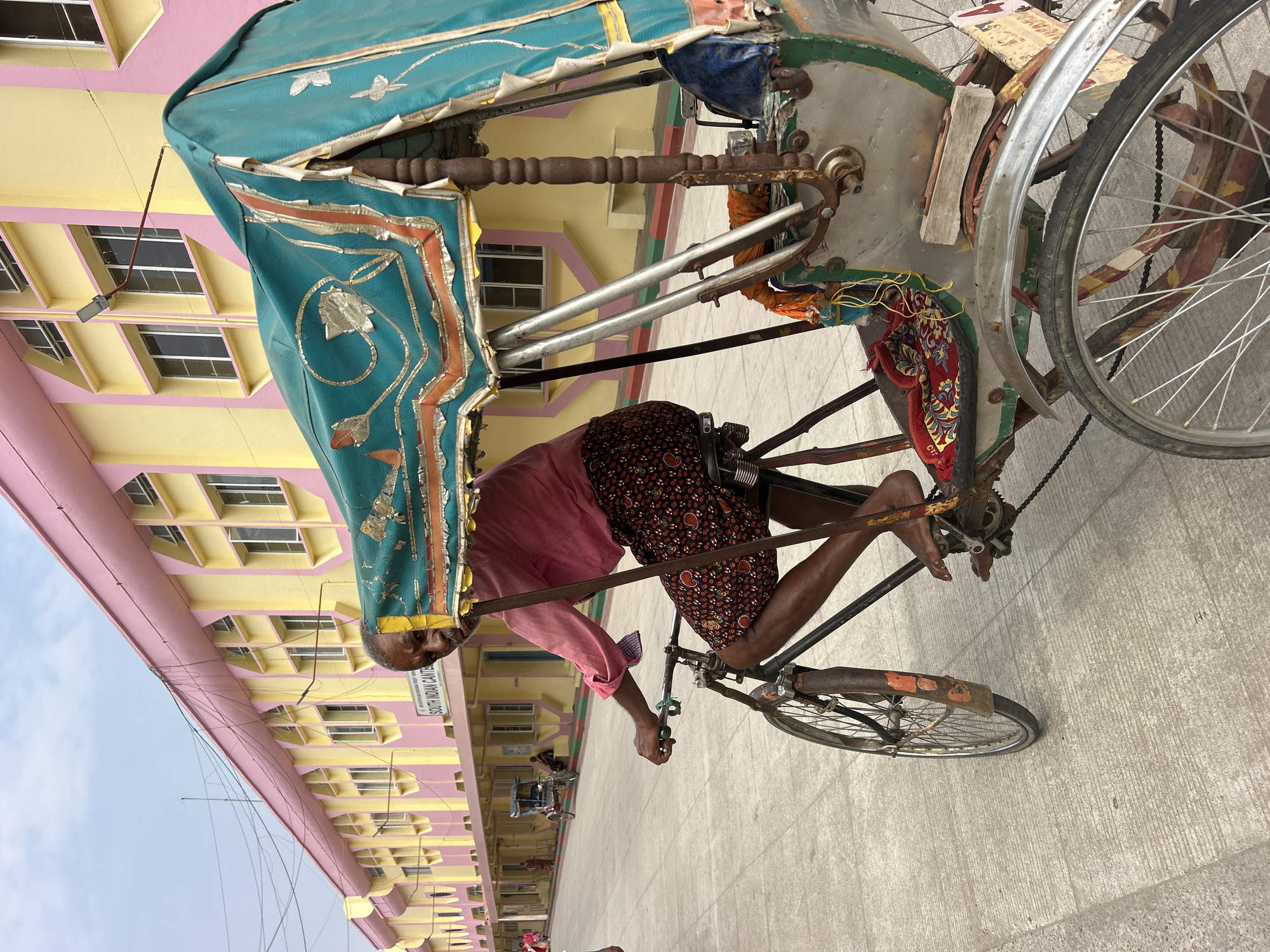 A man is riding a rickshaw on a paved surface in Puttaparthi, India. The rickshaw is decorated with a green canopy edged with gold trim, and the metal parts are weathered and rusty. The man is wearing a pink long-sleeved shirt and patterned shorts. He is pedaling the rickshaw, his bare feet near the pedals. The background shows a building with yellow walls and pink trim, the signage reading "SOUTH INDIAN CANTEEN" in English. The sky is visible in the upper left corner, with a few thin power lines strung across the building.
