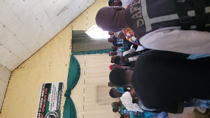 An indoor gathering is depicted, identified by a banner as an event for the Fellowship of Christian Nurses (FCN), VOM Branch, dated July 8, 2017, held within a venue in Dutsen Kato, Nigeria. The banner, positioned on a pale yellow wall, reads "FELLOWSHIP OF CHRISTIAN NURSES (FCN) VOM BRANCH" and includes the motto "CARING FOR THE TOTAL MAN: SPIRIT, SOUL AND BODY." Green and white fabric drapes adorn the wall beneath the banner. The ceiling consists of white panels. In the immediate foreground, two individuals are seen from behind, facing away from the camera. The person on the left wears a plain black short-sleeved shirt. The person on the right wears a white long-sleeved shirt under a dark, possibly navy, vest with the word "SAFETY" printed in white on the back. Beyond these foreground figures, a crowd of approximately 20-30 adults is visible, primarily seated. Many attendees wear varied attire, including traditional Nigerian clothing and head coverings. Some individuals are seen conversing or observing an unseen focal point. On tables in the mid-ground, bottles of water are discernible. A bright doorway or window is visible in the background, providing natural light.