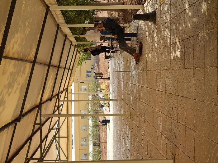 The image depicts an outdoor scene in Jibb as-Safa, Syria, under bright daylight. The foreground and midground on the right are covered by a lengthy, open-sided canopy structure featuring a light-colored, possibly fabric, roof supported by a dark metal frame and white vertical posts. The ground beneath the canopy is paved with light brown square tiles. On the paved area, a male individual is seated facing away from the camera in a dark, open-frame chair, leaning back. He wears a dark long-sleeved top, dark trousers, and light brown footwear. A red and black brush-like object lies on the ground near his feet. A dark, conical object, possibly a bollard base, is also on the ground further right. Further down the covered walkway, three other males are standing in a group, appearing to interact. One wears a dark t-shirt and backpack, another a white long-sleeved shirt, and the third is partially obscured. A light pole with a fixture is visible near this group. To the left of the paved area, an unpaved, reddish-brown dirt or gravel ground extends towards the background. Small trees and bushes are planted along a fence line that separates the paved and unpaved areas. Two individuals are walking in the distant midground on the unpaved area, moving away from the camera towards the buildings. The background features several light-colored, multi-story buildings with multiple rectangular windows, some exhibiting blue frames. Additional trees and vegetation are visible around these structures. The scene is illuminated by natural sunlight, casting distinct shadows of the canopy structure and foliage onto the roof and paved ground.