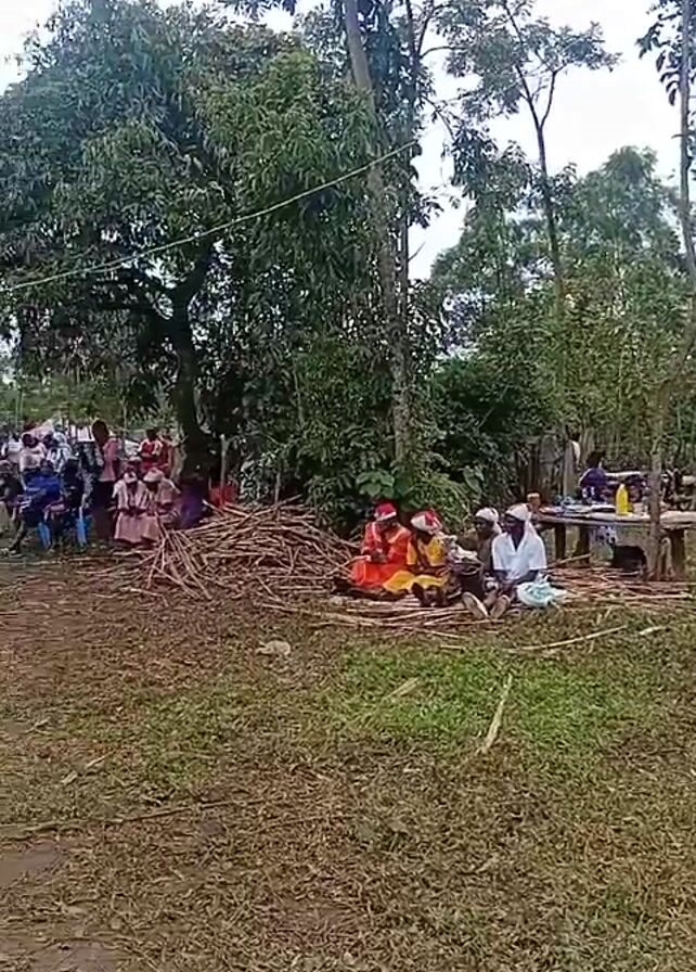 n outdoor gathering of people in a rural area. Some people are seated on the ground, others are sitting on chairs under tents. There are trees and some branches piled on the ground. One person sits at a mixing board and appears to be managing the sound.
