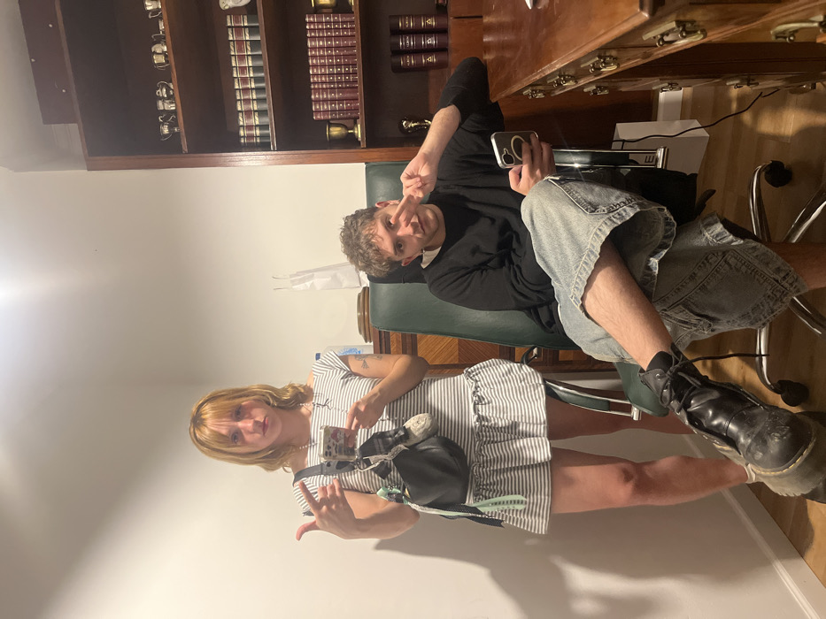 Two people pose indoors; the person in the striped dress on the left points at a phone while making a hand gesture. The person seated behind, in a black shirt and jean shorts, also gestures with their hand, holding a phone. A bookcase and a desk are in the background.