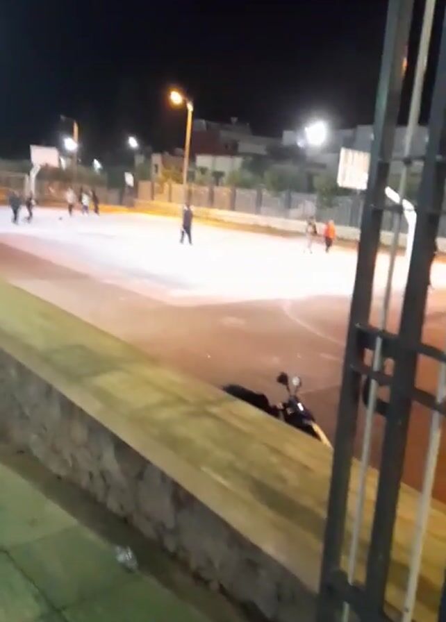 At night, a group of people play basketball on an outdoor court. The court is lit by overhead streetlights, and a low wall surrounds part of the court’s perimeter. A motorcycle is parked next to the wall. A fence partially obscures the view.