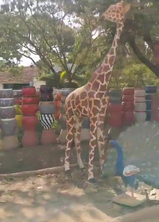 collection of various outdoor decorations and pottery displayed along a street. There are numerous stacks of painted tires and an assortment of pots and planters in different colors, sizes, and designs, some arranged on metal shelves. Statues of animals, including a cheetah, giraffe, and zebras, are visible. A covered bench with a painting of a person on the back wall and a sign with lettering can be seen as well. The scene is outdoors, with trees and foliage providing a natural backdrop. Cars can be heard passing by on the street, indicating the location is likely alongside a road.