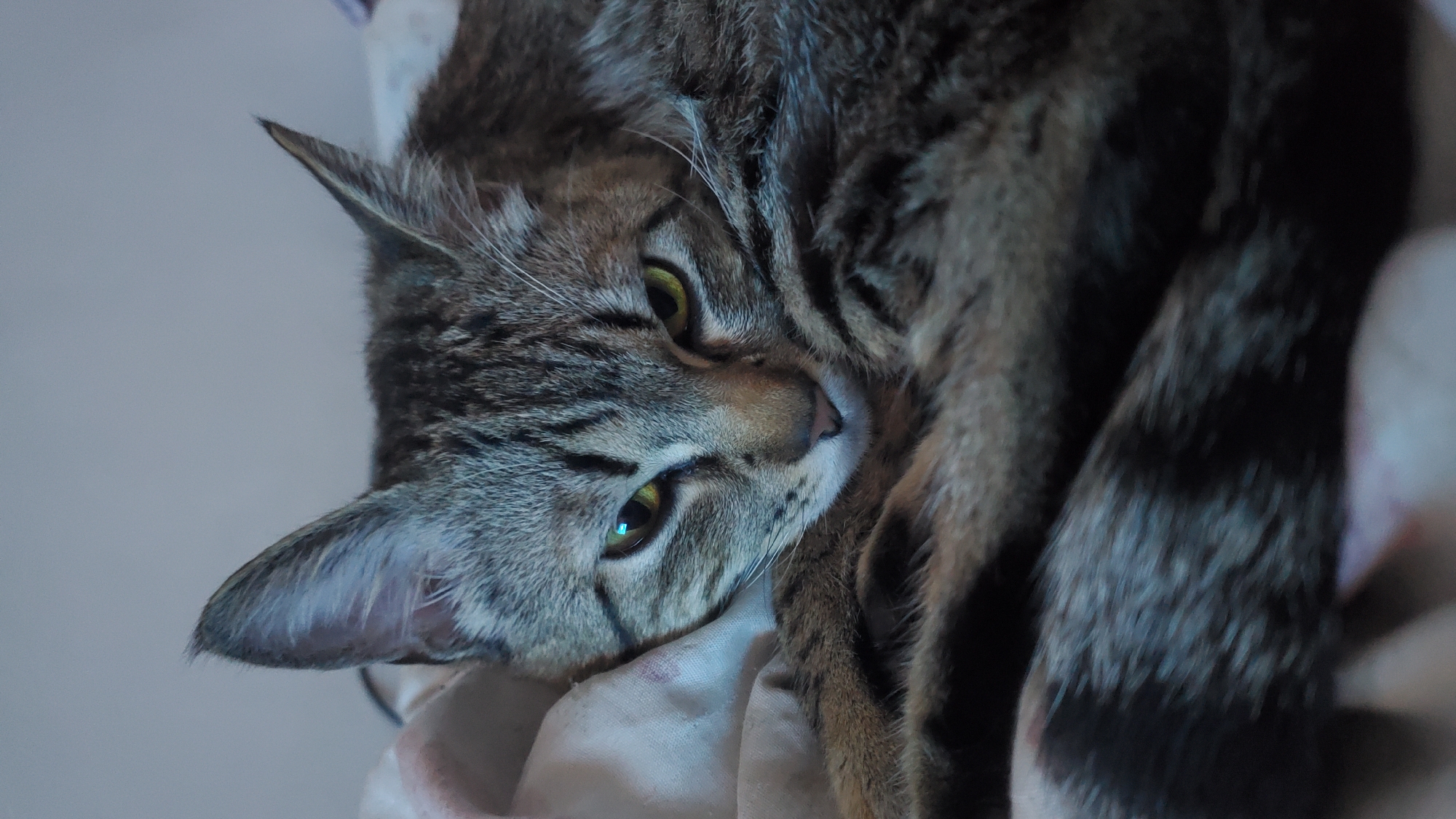 A close-up shot depicts a brown tabby cat lying down