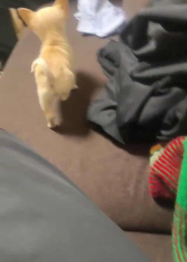 A small tan-colored Chihuahua puppy walks toward a man sitting on a brown couch. The man is wearing a black shirt and dark pants, and he is sitting with his legs crossed, facing away from the camera. He appears to be reading something. The couch has some dark clothing items on it and a crumpled piece of paper. The puppy walks toward the man, then stops at his side. The puppy makes a squeaking sound.