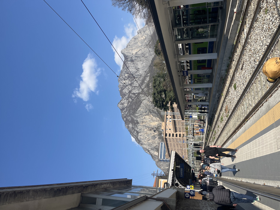 The image depicts an outdoor daytime scene at the Lecco train station in Lecco, Italy, with a prominent mountain range in the background