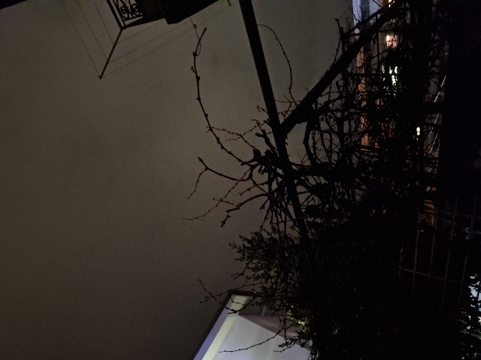 The image depicts an exterior scene at night within the city of Unknown, Unknown. An overcast, dark grey sky occupies the upper half of the frame. In the midground and foreground, a dense silhouette of woody, predominantly leafless branches, likely from a vine, is observed, intricately intertwined with a dark metal trellis structure. A portion of dark evergreen foliage is visible on the lower left, adjacent to the trellised vegetation. To the far left, a section of a light-colored building wall or architectural overhang is partially visible. To the far right, a dark building facade featuring a decorative wrought-iron balcony railing is present, with multiple thin lines, possibly clotheslines or wires, extending diagonally upwards from it. Through gaps in the foreground vegetation, illuminated windows or interior lights of distant buildings are faintly visible in the background, indicating an urban or suburban setting. No individuals or explicit actions are present within the frame.