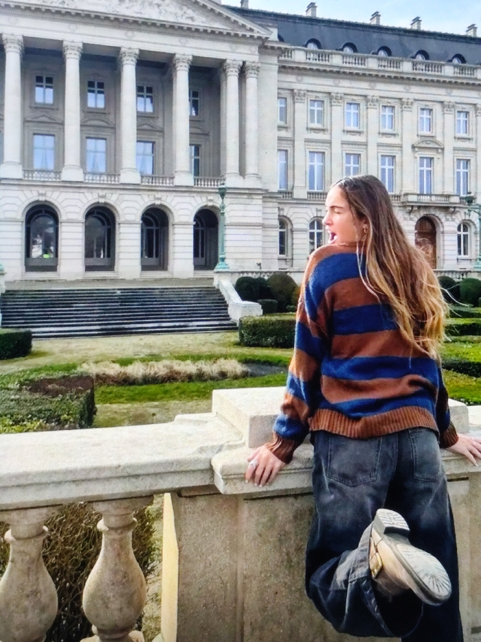 The image depicts an outdoor scene at the Royal Palace of Brussels, viewed from the Parc de Bruxelles in Brussels, Belgium. In the foreground, a female individual is positioned with her back predominantly towards the viewer, leaning on a light-colored stone balustrade. She has long, light brown hair and is dressed in a horizontally striped knit sweater with alternating blue and brown bands, dark wide-leg jeans, and light-colored boots with a visible sole and heel. Her left foot is elevated, resting against the balustrade. A ring is visible on her left hand's ring finger, which is also resting on the balustrade. White wired earbuds are present. Her head is turned to the left, and her mouth is open. The Royal Palace, a multi-story neoclassical edifice featuring a central portico with columns, arched ground-floor windows, and a grand staircase, dominates the background. A manicured garden with green grass, hedges, and patches of dry vegetation lies between the balustrade and the palace. A decorative lamppost is visible to the right of the palace's central entrance stairs.