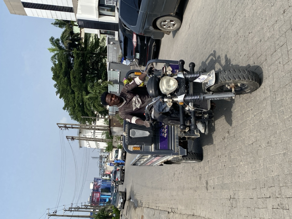 The image depicts an urban street scene in Moba, Nigeria, under clear daylight conditions