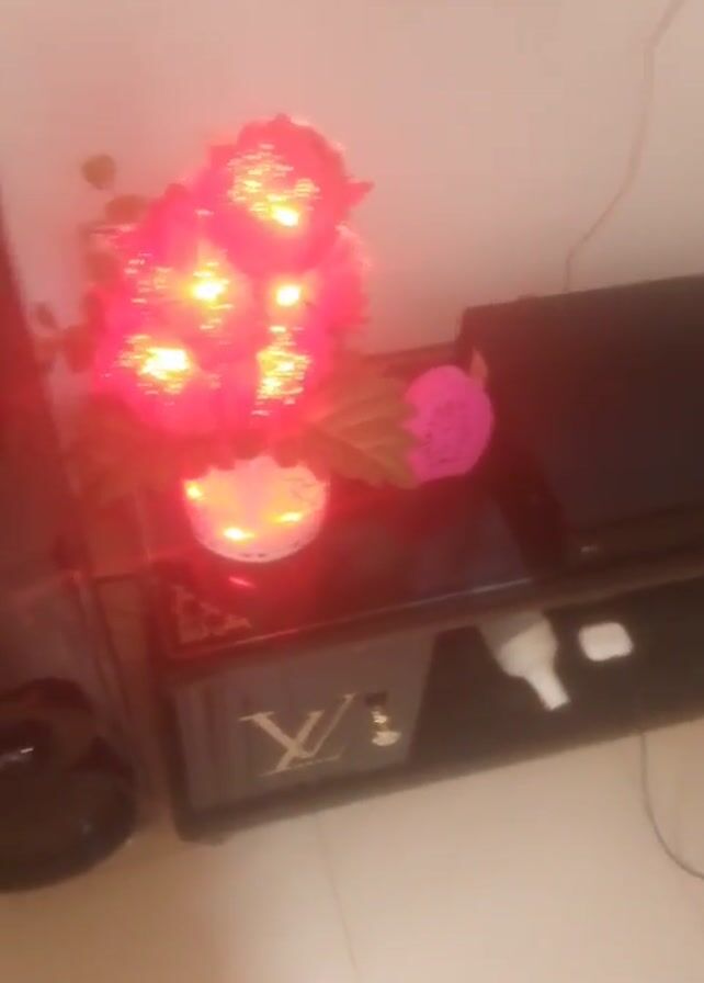 living room scene. There's a black speaker and a black TV stand with a gold "LV" logo. On the TV stand is a decorative light-up flower arrangement with red petals, a pink object, and some other items. Above the TV stand is a TV showing a scene with two people, one wearing a hat. The room has white walls and a light-colored tile floor.