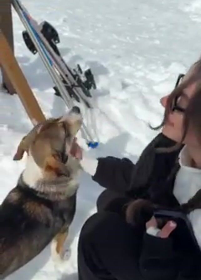 A woman wearing dark sunglasses, a black jacket, and black pants is sitting in the snow, petting a medium-sized dog with brown, black, and white fur on its head. Her hair is in a braid. Ski equipment is leaned against a wooden fence post in the background. The ground is covered in snow.