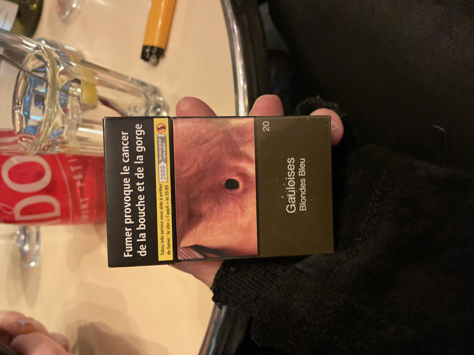 A hand, covered by a black knitted sleeve, holds a pack of Gauloises Blondes Bleu cigarettes in the foreground