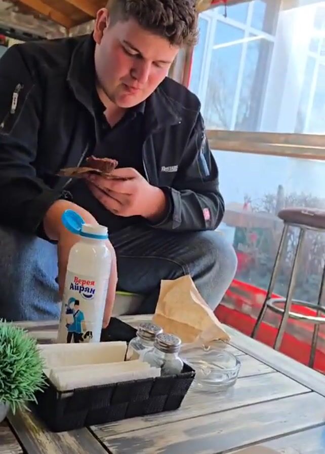 A man is eating a flatbread inside a partially enclosed, outdoor space with a wood roof and red metal window frames. The man is in his mid to late 20s, and he is wearing a black jacket and jeans. He is sitting at a grey, rough-hewn wooden table with salt and pepper shakers, a small potted plant, a container of napkins, a brown paper bag, a small glass bowl, and a container of Ayran on it. The man takes a bite from the flatbread. A woman wearing a white shirt walks past the man in the background.