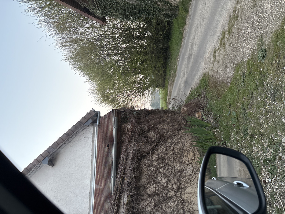 The image depicts a rural or semi-rural scene in Bû, France, viewed from the interior of a vehicle. The perspective is through a window, with a portion of the vehicle's black-framed side mirror visible in the lower left, reflecting a silver/grey car body and the road behind. On the left, a light-colored building with a brown tiled roof features a gable end and a lower roof section. A metal gutter and downspout are present. The lower wall is heavily covered in dark, bare vines/creepers. A small, dark, triangular object is affixed to the upper gable, and a small, dark opening is visible on the lower roof section. Adjacent to this building, a patch of green sprouts grows from the ground, next to a tree stump or large rock. A narrow, unpaved or lightly paved road, appearing grey with lighter gravel patches, curves from the foreground towards the background, situated between two structures. On the far right, partially visible, is another building with a brown tiled roof and a wall densely covered in green ivy. Beyond this, a line of trees with budding light green foliage runs along the right side of the road, extending into the background. Further in the distance, a lighter green field is discernible under a clear, pale blue sky, indicative of an ambient light condition (e.g., dawn or dusk). No individuals or discernible actions are present in the scene.