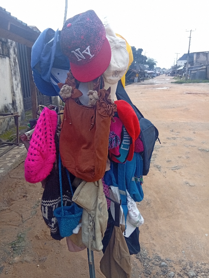 The image displays a roadside vendor's merchandise in Aba, Nigeria, consisting of various hats and bags suspended from a vertical metal pole