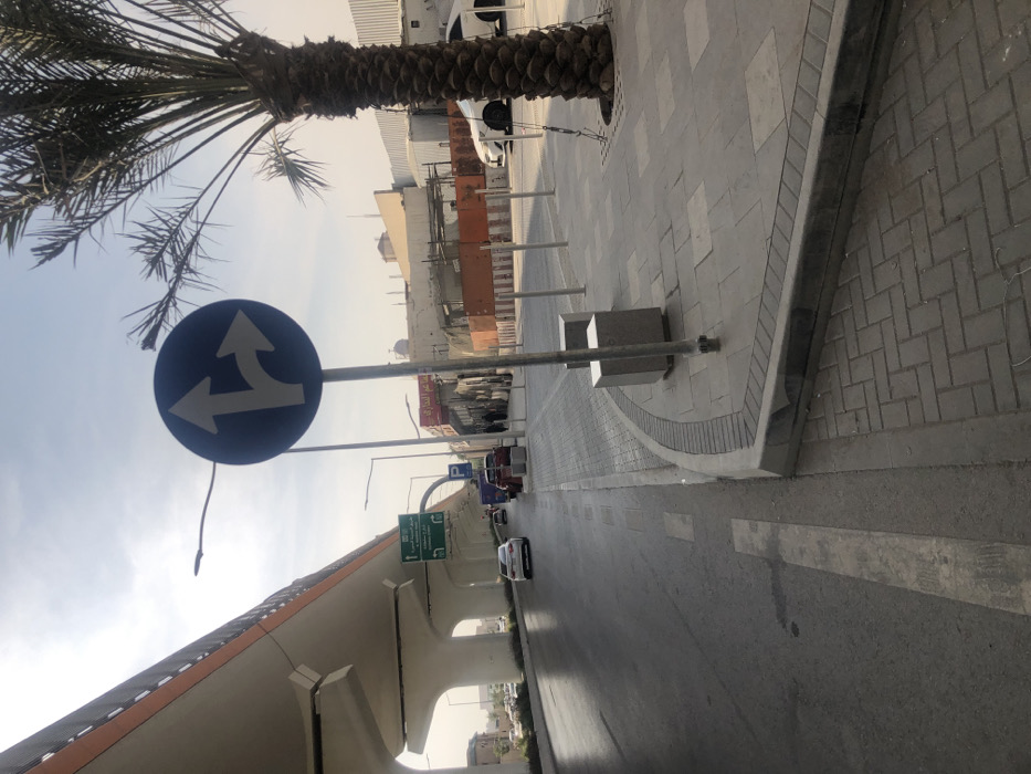 The scene depicts an urban street in Riyadh, Saudi Arabia, under bright, hazy daylight. The view is from a sidewalk, looking down a multi-lane asphalt road that recedes into the distance. On the right side of the foreground, a paved sidewalk features alternating grey rectangular and herringbone-patterned pavers. A tall palm tree with a thick, textured brown trunk and green fronds stands rooted in the sidewalk, its base secured by a metal grate. A blue circular traffic sign, depicting white arrows for straight and right-turn options, is centrally mounted on a metal pole. Several grey metal bollards are spaced along the curb, which delineates the sidewalk from a vehicle area. Two grey cuboid structures are present on the sidewalk near the traffic sign pole. On the left, a prominent elevated concrete highway structure, characterized by large, tapering light-grey support pillars and orange side barriers, extends into the background. Beneath this structure, a green overhead road sign is visible, displaying "Madinah Road" and "King Fahd Road" in both Arabic and English. The asphalt road, appearing partially wet, shows visible white lane markings. A white sedan is observed traveling away from the camera in the left lane. A red pickup truck and other vehicles are parked or stationary on the right side of the road, adjacent to the sidewalk. In the mid-to-far background on the right, a series of low-rise buildings line the street. Some buildings exhibit signs of construction or renovation, with visible frameworks and orange safety barriers. A tall, slender architectural feature, consistent with a minaret, is discernible in the distant background against the hazy sky. Indistinct dark figures, possibly pedestrians, are visible on the far right sidewalk in the mid-background.