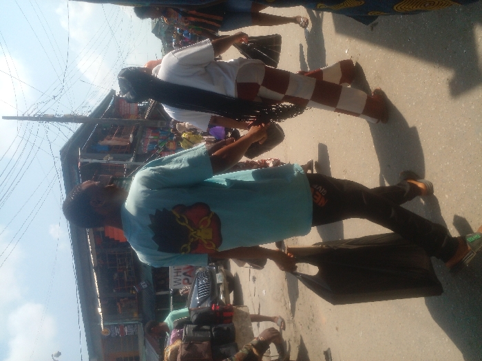 The image portrays a busy street scene in Satellite Town, Nigeria, on a sunny day