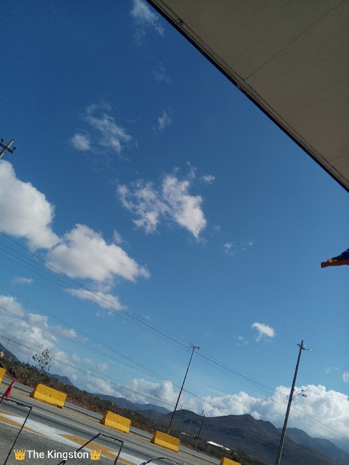 The scene is an outdoor environment in El Dátil, Venezuela, captured from a low, upward-angled perspective with a noticeable tilt to the right. The upper two-thirds of the image are dominated by a clear, vibrant blue sky dotted with scattered white cumulus clouds. An architectural overhang, light-colored and flat, diagonally spans the top right corner. Partially visible beneath this overhang in the upper right is a segment of a flag exhibiting blue and yellow stripes with a visible red tip, consistent with the colors of the Venezuelan national flag. The lower third of the image features a paved road surface on the left, marked with prominent white diagonal lines. A series of bright yellow concrete traffic barriers are arranged along the edge of this road. A single orange traffic cone is partially visible on the far left. Multiple slender utility poles, some with strung wires, rise from the ground on both sides of the visible road section. The midground and background consist of arid, undulating hills and mountains, characterized by sparse vegetation. No individuals, explicit actions, or interactions are present within the frame.