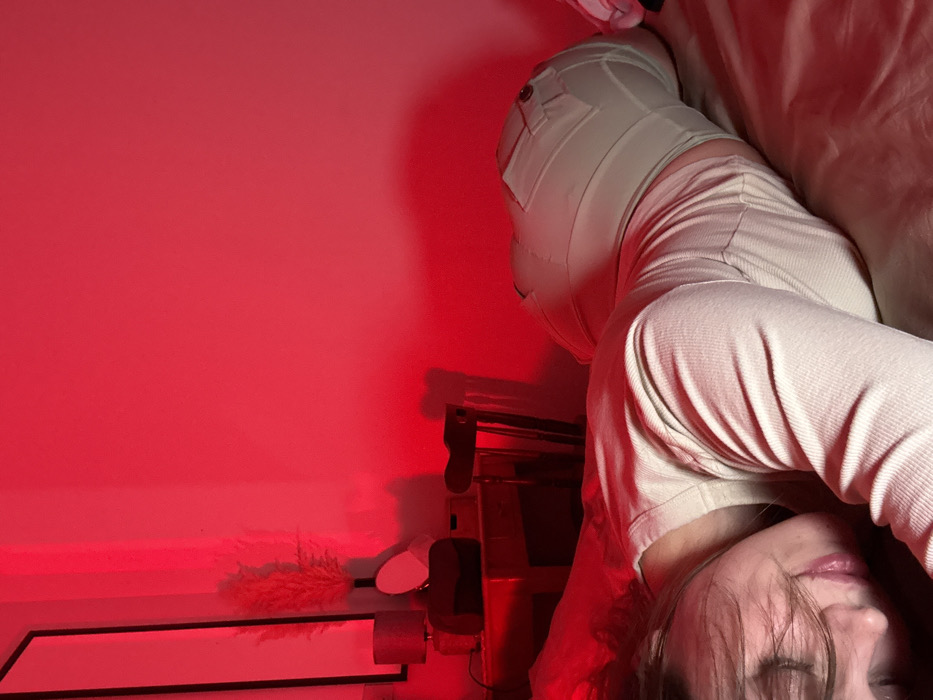 The scene depicts a single individual lying prone on a bed in what appears to be a bedroom located in Fiuggi, Italy. The room is bathed in a pervasive red light. The individual, appearing female, is positioned face down with their head turned slightly towards the left, exhibiting a closed-mouth smile or smirk and closed eyes. They wear a light-colored, long-sleeved ribbed top and matching light-colored pants or shorts, featuring two back pockets with button details. The bedding is a light, possibly beige, solid color. In the background, against a red-illuminated wall, a wooden table or nightstand is visible. Upon this table rests a lamp with a dark base and a light shade, an oval-shaped mirror, and a vase containing light-colored feathery plumes. To the right of the table, a wooden chair with a slatted back is positioned. A tall, dark-framed mirror or picture frame hangs vertically on the wall to the far left. Shadows are distinct on the wall, indicative of the strong, singular light source.