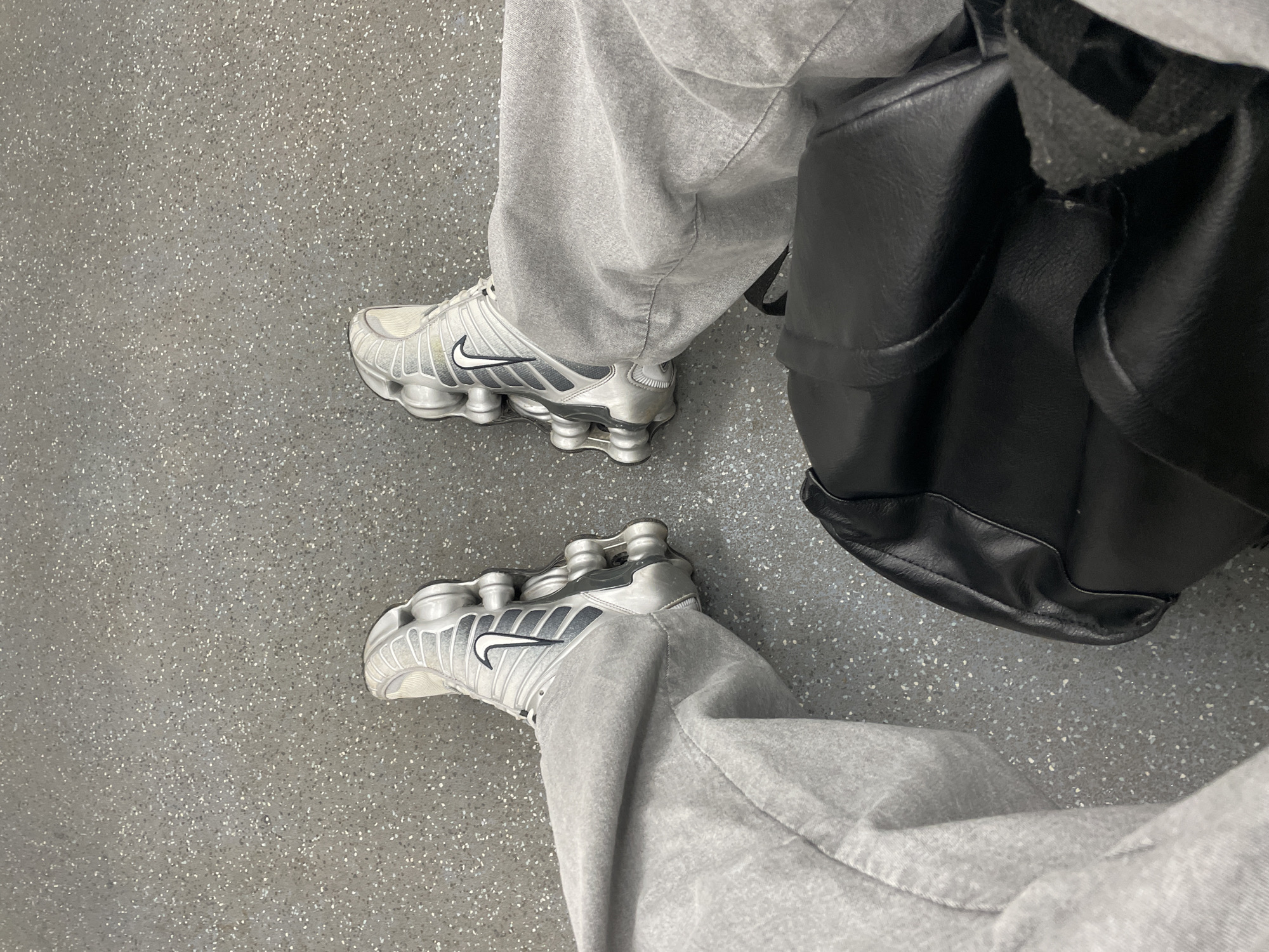 A first-person perspective shot depicts a person seated, wearing grey sweatpants and silver Nike Shox sneakers