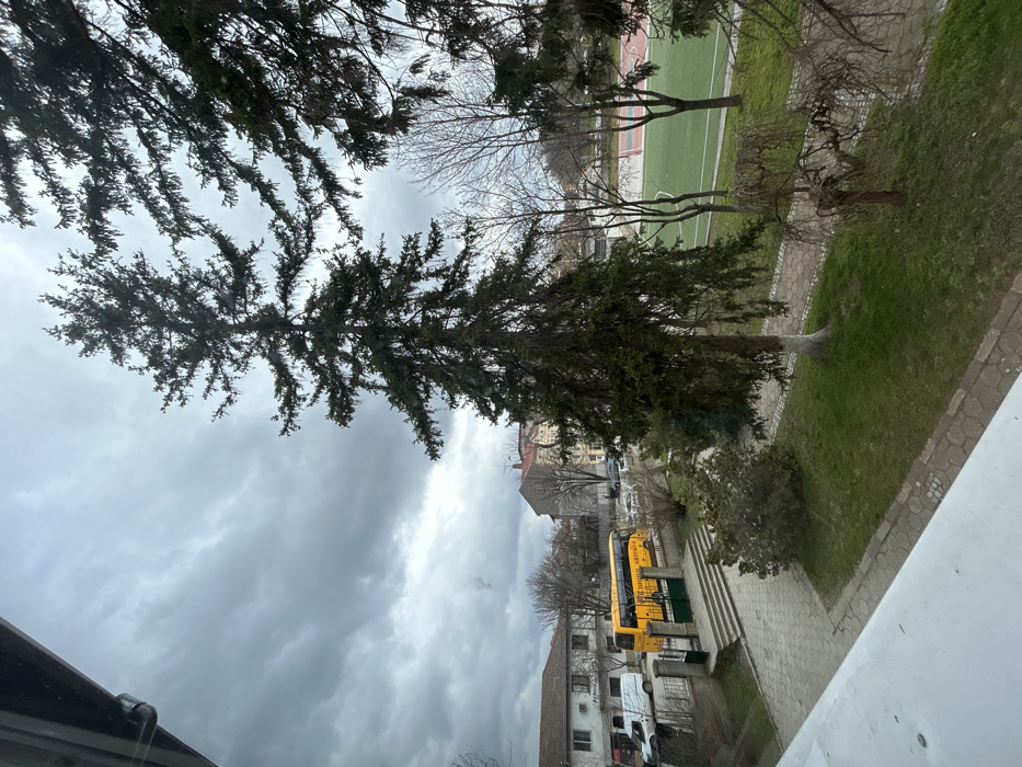 The image presents an elevated view, likely from a window, of an urban scene in Dolni Dabnik, Bulgaria, under a heavily overcast sky. In the immediate foreground, a white window ledge is visible. The scene transitions to a park-like green space featuring a large, dark green conifer tree with a white-painted lower trunk, positioned centrally. To the right, another conifer's branches extend into the frame, and a smaller, bare deciduous tree with twisted branches stands further right. The ground is covered in green grass. A paved walkway of grey interlocking pavers leads down a set of steps towards a street on the left. Dark green metal gates are visible at the base of these steps. On the street, a bright yellow school bus, displaying "УЧЕНИЧЕСКИ АВТОБУС" (SCHOOL BUS) in Cyrillic on its side, is prominent. A white commercial van is parked further left on the street, and additional parked vehicles are visible in the distance. Various residential buildings line the street, characterized by light-colored facades and pitched roofs. In the background, beyond the green space and trees, a bright green artificial turf sports field with white and red markings is clearly visible, suggesting a football or multi-sport pitch. The overall environment depicts a blend of residential architecture, urban infrastructure, green spaces, and a sports facility, typical of a town setting. No individuals are distinctly visible performing actions.