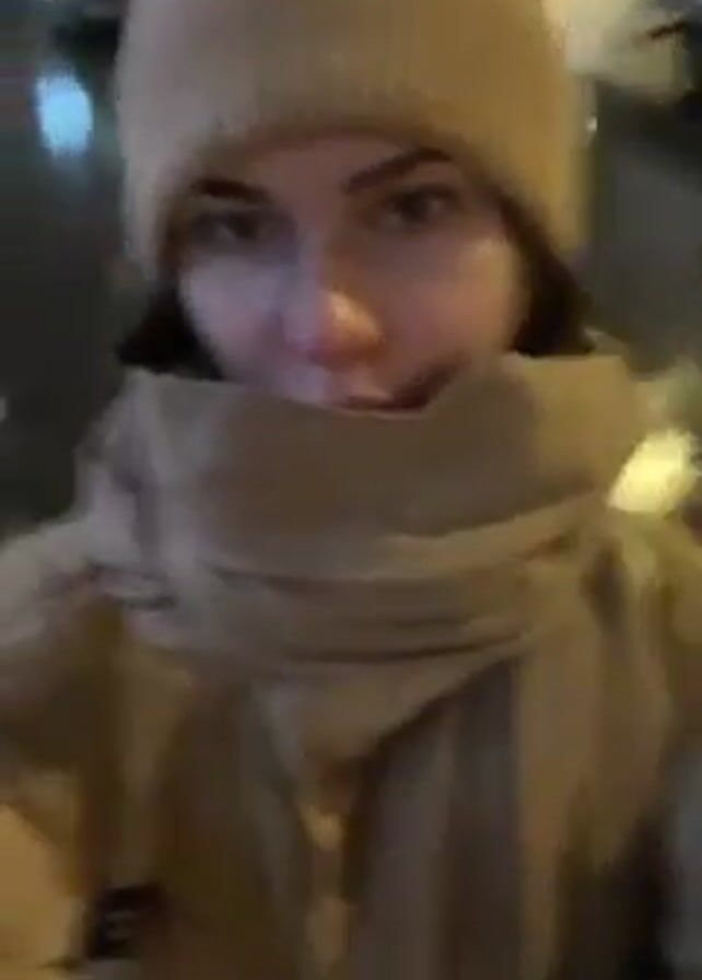 A person wearing a beige beanie, a large beige scarf covering most of their face, and a tan jacket is walking down a street at night. The street appears wet, possibly from rain, and there are buildings and streetlights visible in the background. A truck is parked near the edge of the frame. The person appears to be recording themselves.