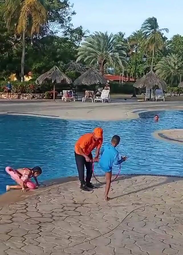 lifeguard helping a boy use a hula hoop by the side of a swimming pool. The lifeguard is wearing an orange shirt and hat and dark pants. The boy is wearing a blue swimsuit. Two girls in pink swimsuits are at the edge of the pool behind them. The pool is surrounded by a stone patio. In the background, there are palm trees, thatched umbrellas, and lounge chairs with people sitting on them. There is also another person swimming in the pool. The sky is blue and clear. The video is slightly shaky.