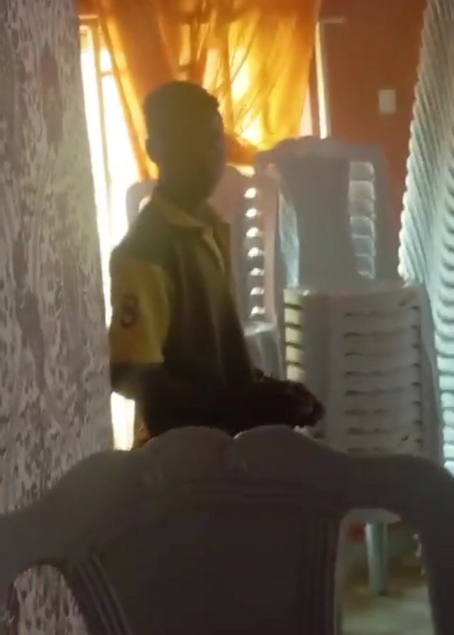 person in a green and yellow shirt standing in a room filled with white plastic chairs stacked high. A sheer orange curtain covers a window in the background. A white carved chair is partially visible in the foreground, slightly obscuring the view. The person turns to face away from the camera.