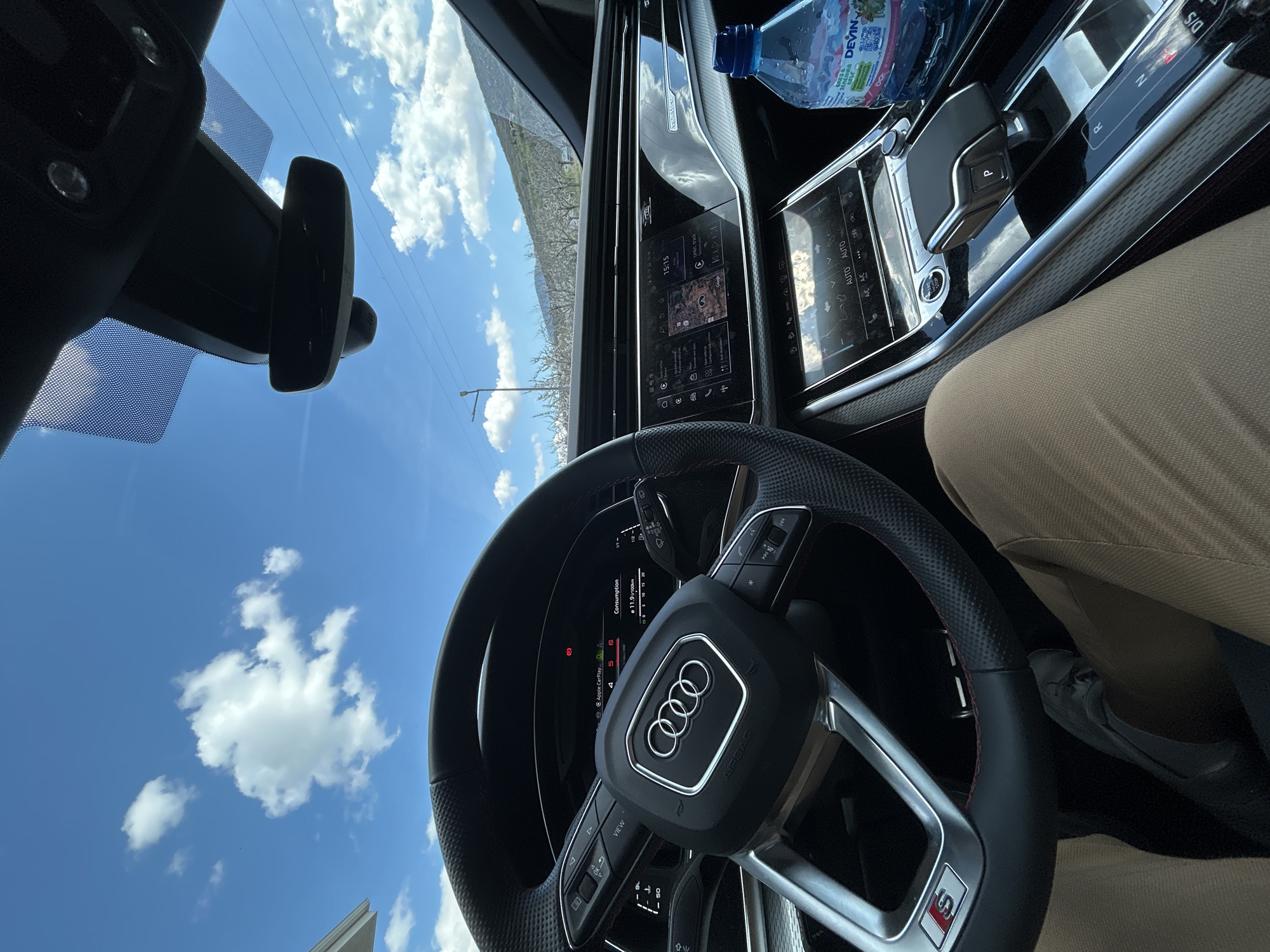 interior of an Audi vehicle, focusing on the steering wheel, dashboard, and center console. The steering wheel features the Audi logo and various controls. The dashboard includes digital screens displaying information such as time, consumption, and Apple CarPlay interface. The center console has controls for auto, A/C, parking brake, and gear selector. There's a bottle of "Devin" water on the console. A person's leg, clad in khaki pants, is visible beside the console. Outside the car, the sky is blue with white clouds, and there is a glimpse of what seems to be a mountain range. Text on the dashboard suggests that the vehicle is in the vicinity of the city of Brestnik, Bulgaria.