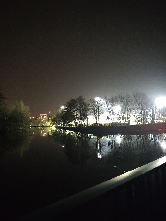 The image depicts an urban nighttime scene over a body of water, identified as a river or canal in Strasbourg, France. The foreground features a dark, diagonal railing or barrier visible in the bottom right quadrant. The majority of the lower and central frame is occupied by a calm, dark body of water reflecting numerous artificial light sources and the silhouettes of trees from the opposite bank. Along the distant bank, a line of deciduous trees, largely bare of foliage, stands prominently. Behind these trees, multiple bright, white artificial lights are visible, casting illumination upwards and reflecting intensely on the water's surface, creating vertical streaks of light. Among the trees on the opposite bank, a small structure with a dark, possibly pointed roof is discernible. In the far left background, several illuminated multi-story buildings are visible, suggesting urban development beyond the immediate waterfront. To the far right, strong, diffuse bright light sources are present, possibly originating from large buildings or area lighting. The sky is dark, consistent with nighttime, showing a faint glow of light pollution near the horizon. No individuals, vehicles, or discernible actions are present in the frame. The overall environment is illuminated by artificial light against a dark natural backdrop.