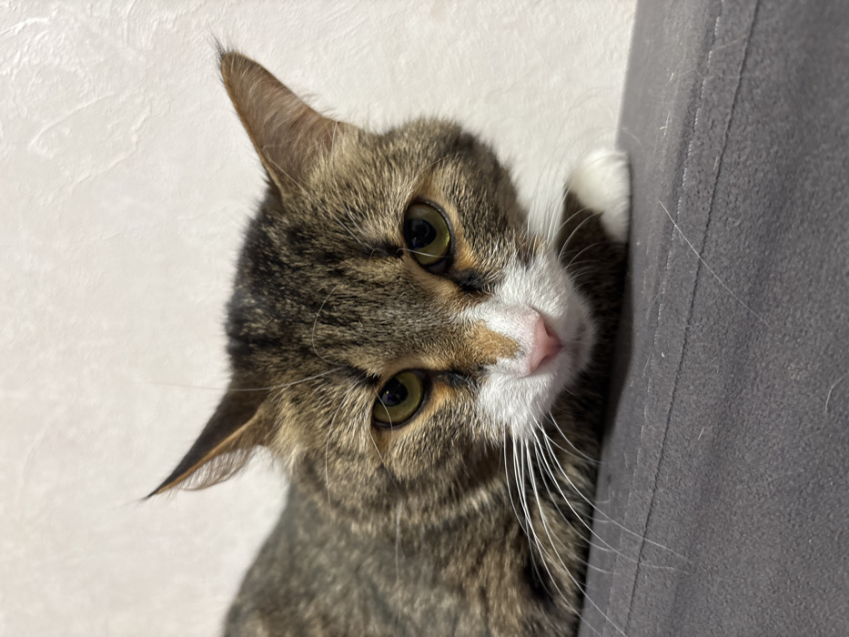 - "The image displays a domestic short-haired cat in a close-up, eye-level perspective, lying on a dark grey upholstered surface" by FM-oAmG62, licensed under CC BY 4.0