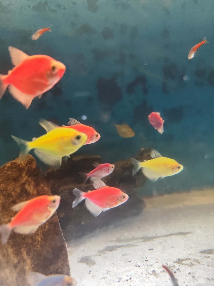 The scene depicts an aquatic environment inside an aquarium, located in Mapusa, India. The tank contains clear water, numerous fish, and substrate materials. The bottom of the aquarium features a light-colored sandy or fine gravel substrate with scattered dark particles. A large, dark, irregular rock formation is visible in the lower-left to mid-left section, resting on the substrate. The background of the aquarium is a uniform blue-green color. Multiple fluorescent-colored, tetra-like fish are actively swimming throughout the tank. Dominant colors include bright red, vivid yellow, and distinct pink. A large red fish is prominently positioned in the upper-left quadrant, facing right. Below it, in the mid-left, two fish are visible: one bright yellow fish swimming left, with a bright red fish positioned slightly above and behind it, also facing left. Further back and to the right of these, a smaller pink fish swims. In the mid-right section, a yellow fish is observed swimming left. Another prominent pink fish is located in the lower-middle, facing right. Additional smaller, less distinct red or orange fish are visible in the upper-right portion of the tank. No human figures or discernible human-made objects other than the implied aquarium structure are present.