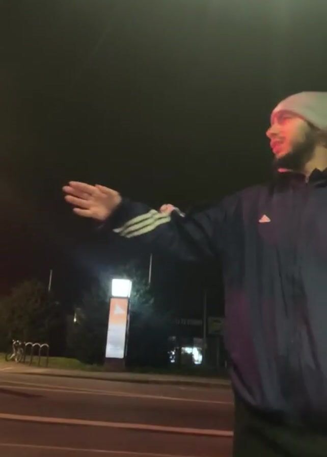 A man wearing a blue tracksuit and a grey beanie is seen on a street at night. He gestures towards the camera, then throws the object being held. The camera is then pointed towards a building across the street with a lit-up sign. The surrounding environment includes trees, a streetlight, and a bicycle rack.
