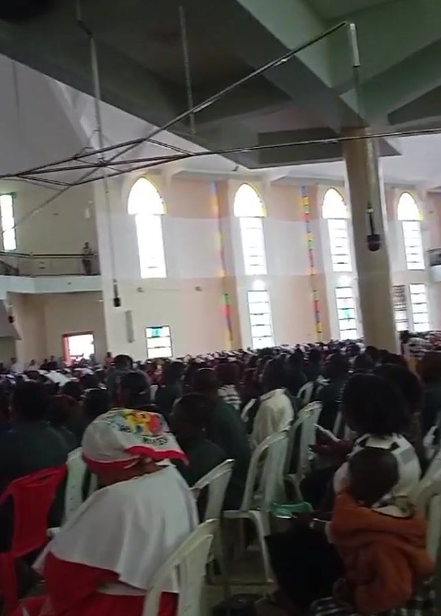 A video shows a crowded interior space, likely a church or large hall. Numerous people sit on white plastic chairs. Some individuals are dressed in distinctive attire, including a person in a red and white robe, possibly clergy. The camera pans slowly across the room, capturing the large audience, the architecture of the building, and several arched windows. The building has a balcony with additional attendees. A pillar stands on the left side of the frame in the foreground. The video ends with a brief sound of applause.