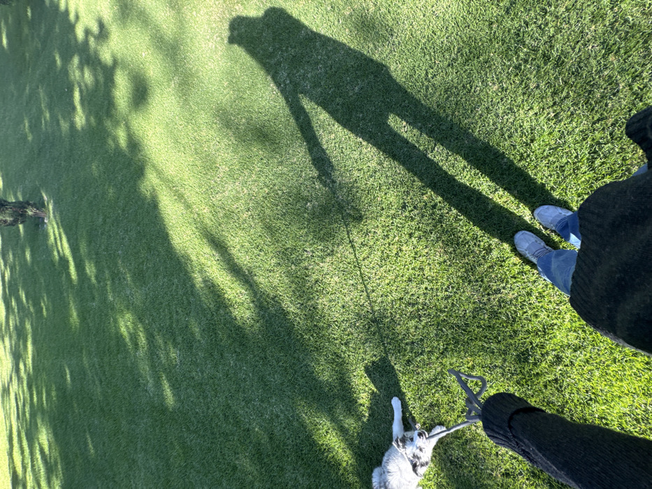 An overhead shot shows a person and a dog on a grassy lawn. The person is wearing jeans and blue sneakers. The dog is gray and white and is tugging on its leash. The person's shadow stretches out in front of them, long and distorted. Tree shadows also fall across the lawn.