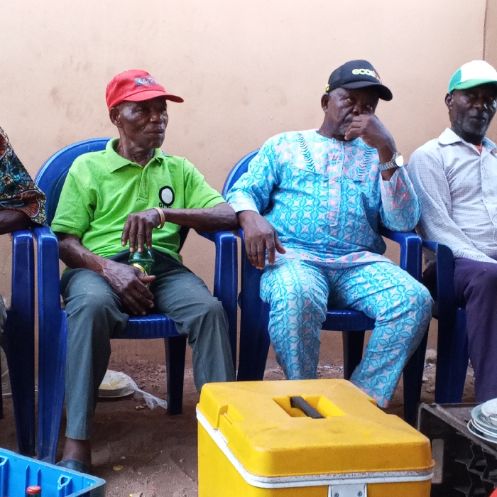 - "Three adult males are seated in blue plastic chairs against a plain, light-tan wall on what appears to be reddish-brown dirt ground in Orlu, Nigeria" by FM-zGgZ32, licensed under CC BY 4.0