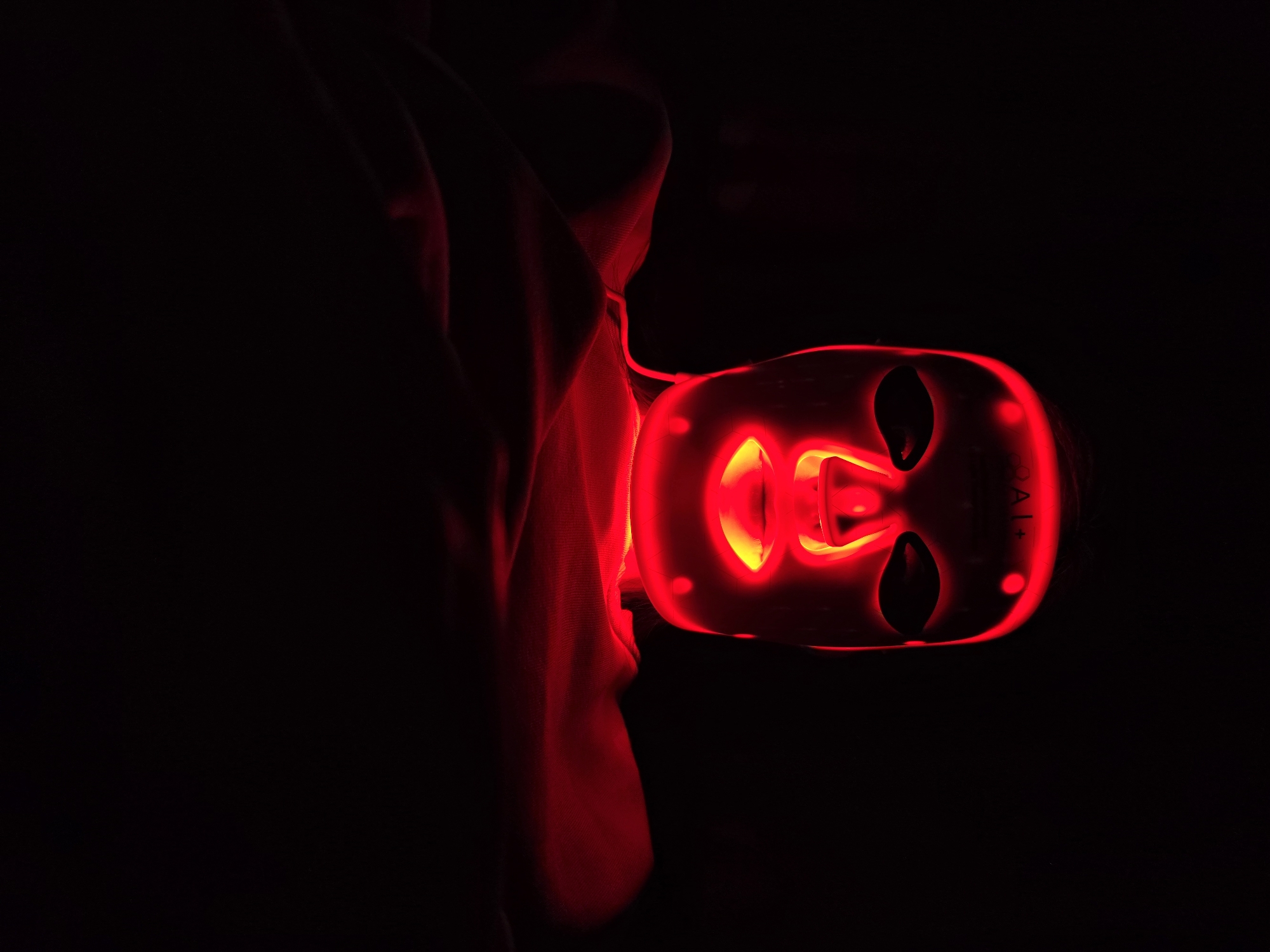 A close-up, slightly low-angle shot, shows a red LED face mask illuminated in a dark environment