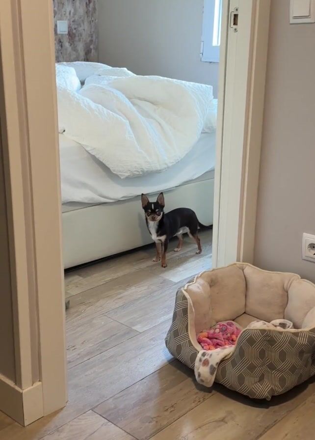 small black, white, and tan chihuahua standing in a bedroom next to a white bed and a dog bed. The dog faces the camera for a moment, then takes a few steps forward, walking from the edge of the bed toward the dog bed. The room is visible through a doorway, and the bedroom floor is made of light-colored wood-look planks. The dog bed is patterned with grey and white and contains a pink blanket. A white light switch is on the wall next to the doorway. Background audio contains voices speaking in a foreign language and music.